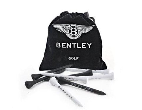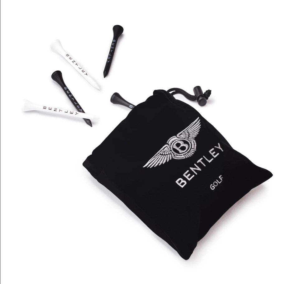 The Bentley Golf Tee Bag comprises of 30 premium 60mm wooden tees in a soft touch draw string bag. Contents: 15 white tees with a black Bentley logo and 15 black tees with a white Bentley logo.