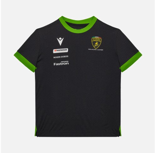 The black kid's sports t-shirt guarantees superb breathability and helps you to stay cool throughout play thanks to its super-light and breathable Zephiro main fabric, paired with a mesh back. The taped, laser-cut perforation on the sides of the shirt provides maximised air circulation. The Automobili Lamborghini Squadra Corse logo is applied on the left front. Further embellished by the colors and the official sponsors of the Racing Team.