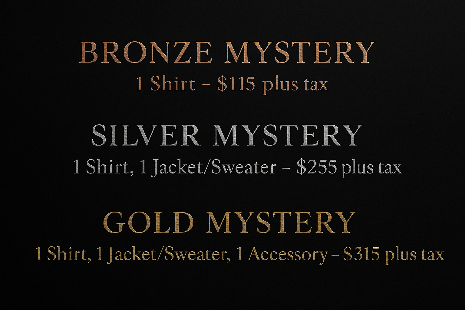 Looking for a surprise? Our Mystery Bags are the ultimate way to score exclusive pieces at a special price — packed with premium styles, chosen at random from our current and past collections. Each bag is sealed and ready to surprise you. No matter which tier you pick, you’ll get real value — and a mystery worth unwrapping.