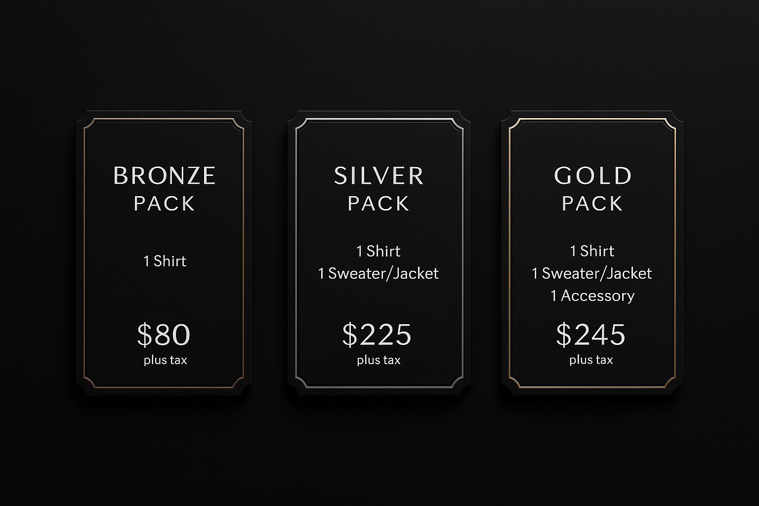 Gold- includes 1 random shirt or polo,1 random sweater/jacket, 1 random accessory (retail value $375+)